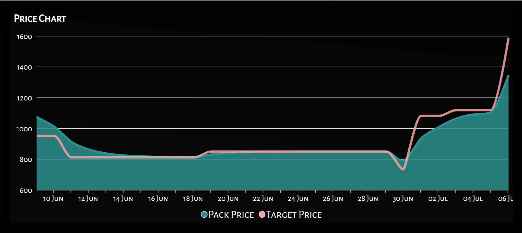 During the daily reset at 1:00 UTC, the actual pack price in VALOR is set halfway between the current price and the target price, 24 hours in advance. So you will always know the following day's pack price in addition to the current price, and market activity will not affect the pack price for at least 24 hours.